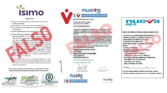 El último caso conocido tiene que ver con una oferta de empleo de Ísimo y la Nueva EPS, se han detectado falsas convocatorias de almacenes reconocidos, donde se invita a las personas a consignar sumas de dinero para costear el valor de exámenes médicos y solicitando una serie de documentos a vuelta de correo: afiliación a EPS, fotocopias del documento de identidad, certificación bancaria, certificación del fondo de pensiones, entre otros.