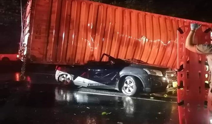 Tractocamión, marca Kenworth, color verde, conductor persona de sexo masculino, quien realiza al parecer una maniobra evasora con el fin de no colisionar vehículo tipo camioneta que se encontraba en el mismo sentido vial, sufriendo volcamiento lateral derecho, ocasionando con la carga el aplastamiento de la camioneta.