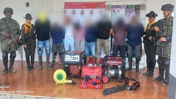 Durante el operativo, las autoridades capturaron en flagrancia a 8 individuos de diferentes edades, quienes carecían de permisos para la explotación minera. Además, se incautaron dos plantas eléctricas, un taladro industrial electrónico, una motosierra y una ventabiola, herramientas que aparentemente eran utilizadas para la extracción ilegal de minerales en el sector.