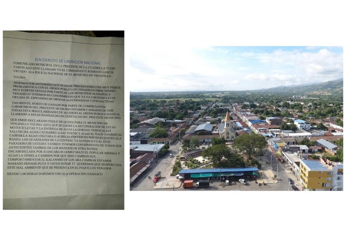 La mal llamada limpieza social anunciada en el pasquín está firmada, supuestamente, por miembros del Ejército de Liberación Nacional – ELN, los cuales también se atribuyen el poder para instaurar toques de queda a partir de determinadas horas.