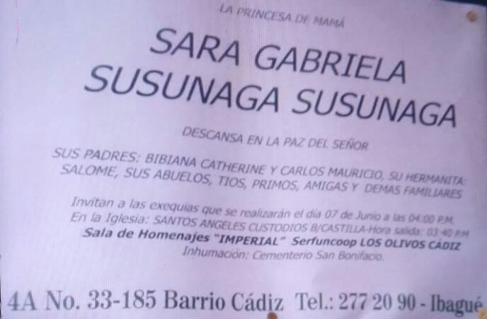 Luego que la familia adelantara los trámites para reclamar el cuerpo de la pequeña Sara Gabriela Susunaga, se conoció el lugar y la hora de las exequias de la pequeña quien falleció en extrañas circunstancias al interior de la institución educativa Liceo Nacional, donde también lamentaron profundamente lo ocurrido.