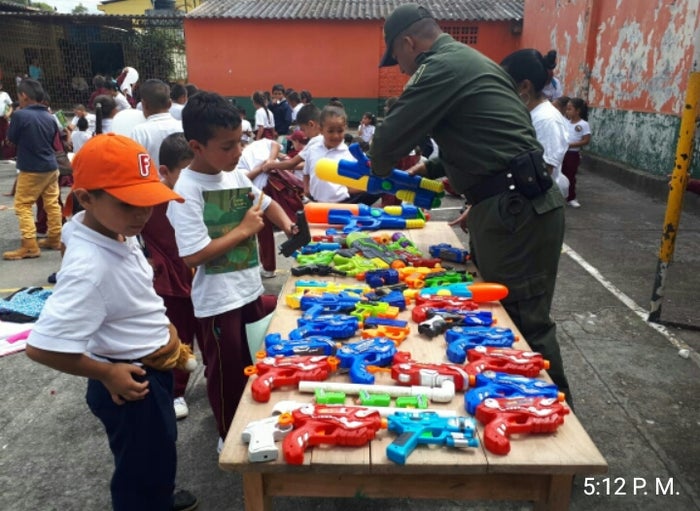 En desarrollo a la estrategia de colegios y parques seguros en el municipio de Casabianca, uniformados del grupo de infancia y adolescencia, grupo de prevención y educación ciudadana en coordinación con la Secretaría de Salud, Comisaria de Familia y Secretaría de Gobierno realizaron una campaña de desarme de juguetes bélicos.