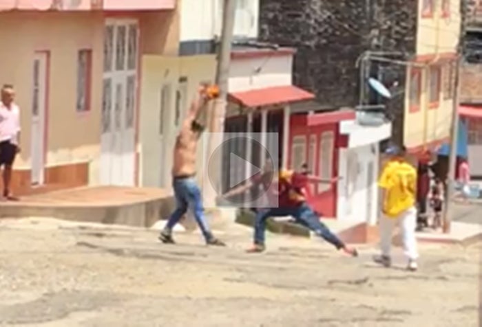 De la acalorada discusión se suministra un video grabado por uno de los vecinos que decidió ocultar su identidad para no verse envuelto en problemas, en el cual se ve como los involucrados con cuchillo en mano se realizan varios ‘lances’ hasta caer, pasando los cuchillos muy cerca de sus cuerpos, se levantan de nuevo y continúan con la reyerta.