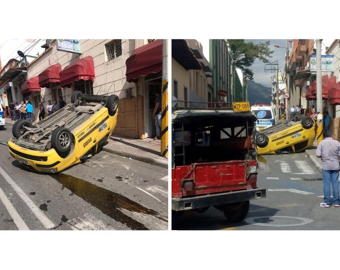 En este punto, un vehículo de transporte público tipo taxi, de placa TGL 518 y número interno 00585, sufrió volcamiento luego de protagonizar un aparatoso accidente contra un campero de color rojo, identificado con el número de matrícula MZP 088.