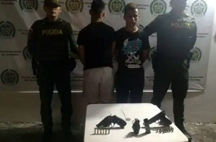 De acuerdo a la información suministrada por las autoridades, estos dos jóvenes tenían en su poder un revólver calibre 38, una pistola calibre 9 milímetros, 13 cartuchos para las armas y una granada de fragmentación tipo IM26.