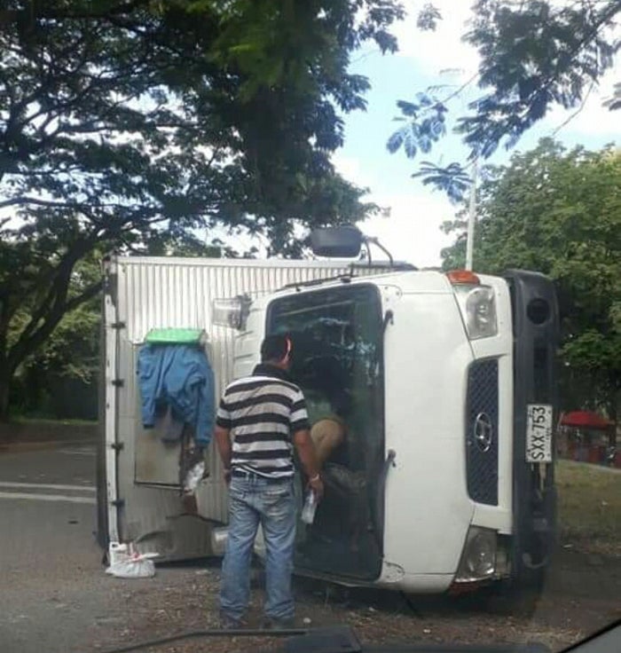 El aparatoso accidente de tránsito se presentó sobre las 8 de la mañana en inmediaciones del municipio del Espinal, frente a la glorieta de Texpinal, luego que el conductor de un vehículo de carga pesada tipo furgón terminara volcándose lateralmente al perder el control por una presunta distracción.