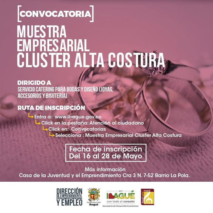 Hasta el 28 de mayo estará abierta la convocatoria para los microempresarios interesados en exponer sus prendas en la muestra “Clúster de alta costura 2019”, evento que se llevará a cabo el 13 y 14 de junio. En esta exposición, la Secretaría de Desarrollo Económico apoyará a 10 microempresarios.