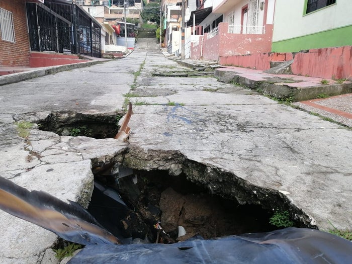 Como si fuera poco, justo unos metros más arriba, existe otro hueco que se abrió producto de un daño en la tubería de agua potable, lo que ha ocasionado que otra sección de la malla vial se comience a cuartear, y ha creado una emergencia peor, ya que se ha filtrado por el andén, llegando a la base de las casas que comienzan a sufrir graves daños en sus cimientos.