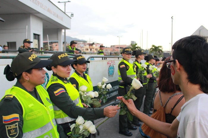 Al momento en que el grupo de manifestantes llegó a las instalaciones de la METIB en la Calle 21 con Avenida Ferrocarril, fueron recibidos por los uniformados que empuñaban en sus manos flores blancas, las cuales intercambiaron con los jóvenes en un gesto de solidaridad y deseos de paz.