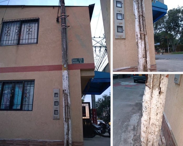 El poste construido en concreto se ha venido deteriorado hasta el punto que ya se encuentran expuestas las varillas de hierro y se teme que en cualquier momento pueda colapsar y ocurrir una tragedia.