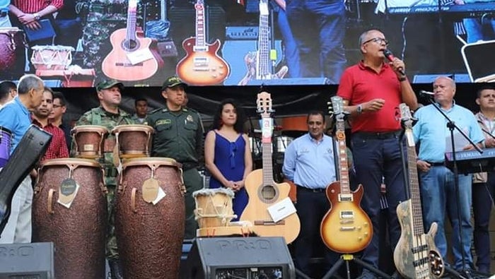 Y agregó. "Estos instrumentos musicales los entregamos a la Orquesta de la Policía Metropolitana, a la Banda Sinfónica de la Quinta División del Ejército Nacional, al Conservatorio del Tolima y a las Instituciones Educativas: 'Técnica Músical Amina Melendro de Pulecio" (Conservatorio de Ibagué) y Técnica Ambiental Combeima de Chapetón, Cañón del Combeima.