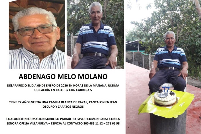 El hombre es Abdenago Melo Mola, tiene 77 años y al momento de su desaparición vestía una camiseta blanca de rayas y pantalón, jean de color oscuro, calzando zapatos negros. Don Abdenago es de piel trigueña, usa gafas de marco negro y su cabello es blanco.