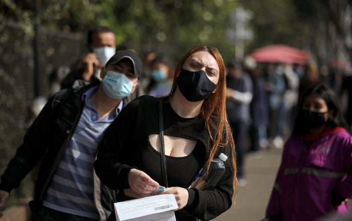 AFP Las personas hacen fila para ingresar a un punto de vacunación contra el COVID-19, en Bogotá.