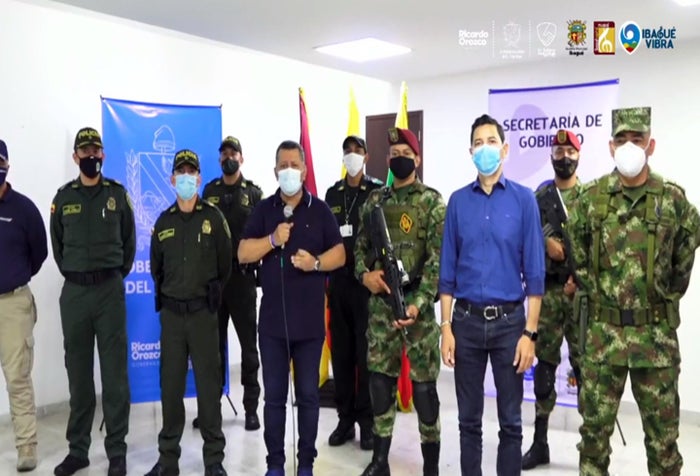 A través de una rueda de prensa extraordinaria el gobernador del Tolima, Ricardo Orozco, acompañado del alcalde de la ciudad de Ibagué, Andrés Fabián Hurtado, tomaron la decisión de militarizar la capital tolimense luego de los desmanes y malos comportamientos que se han generado por parte de la ciudadanía desde esta semana.