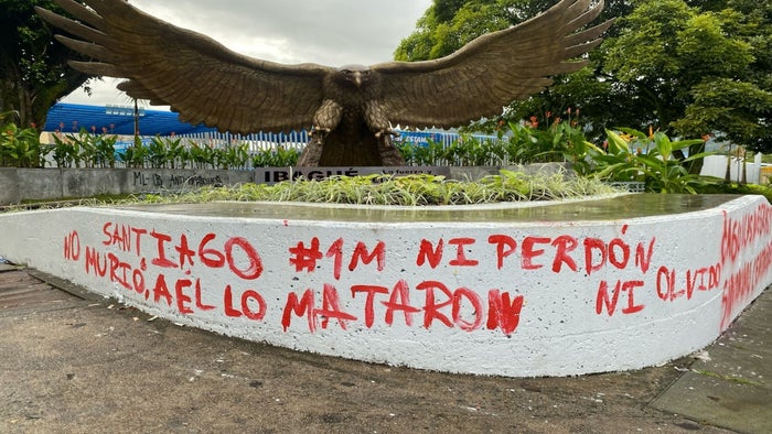 El ataque a la estatua no solo fue un acto de vandalismo, sino también un mensaje político, ya que los delincuentes dejaron grafitis en la base del monumento. Las inscripciones incluían frases como "Aranda y Hurtado - ratas y ladrones" y "¿Águilas Negras? Sinónimo Centro Democrático", así como un mensaje en referencia a Santiago, un caso que ha conmocionado a la sociedad, que decía: "Santiago no murió, a él lo mataron, ni perdón ni olvido".