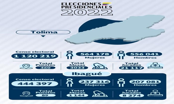 De ese censo electoral en El Tolima, 564.178 son mujeres y 556.041, hombres. Las autoridades electorales instalarán este domingo, 3.033 mesas ubicadas en 460 puestos de votación. De igual manera, están autorizados 21.117 jurados de votación.