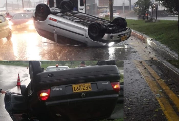 Tras las fuertes lluvias que azotaron desde tempranas horas de la mañana a la capital tolimense, se han registrado varias situaciones, entre ellas el volcamiento total de dos automotores, quedando ‘llantas arriba’.