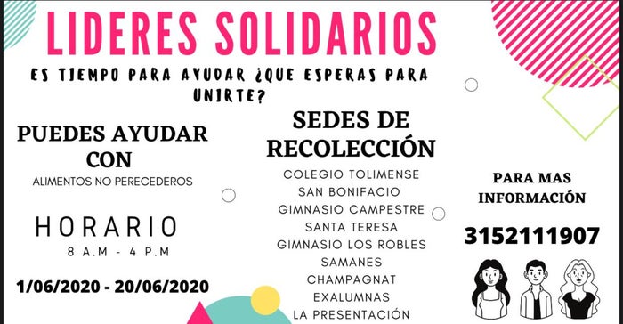 Esta idea surgió de varios entes de gobierno escolar de las instituciones educativas de Ibagué, dónde se decidió iniciar con una campaña para solidarizarse con la comunidad que se ha visto vulnerable por esta situación del Covid-19. Esta campaña inició desde el pasado 01 de junio hasta el 20 de junio dónde las personas que quieran ayudar para aportar alimentos no perecederos deben llevarlos a las sedes de recolección.