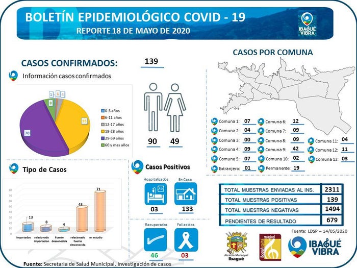 El Coronavirus Covid-19 está disparado a nivel nacional y la capital del Tolima no es la excepción, de acuerdo al último boletín emitido por el Ministerio de Salud a través del Instituto Nacional, Ibagué sigue registrando 139 casos de contagio por la pandemia, de los cuales, desafortunadamente tres de ellos han perdido la vida.