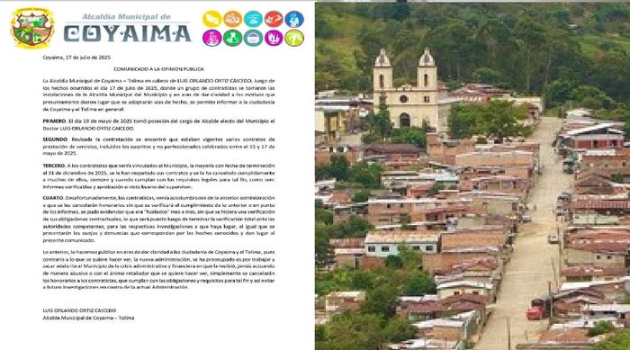 Hasta el momento, la protesta se mantiene en el Palacio Municipal de Coyaima. Una comisión de contratistas se encuentra en diálogo con la Defensoría del Pueblo, el alcalde Luis Orlando Ortiz y funcionarios de la administración municipal, buscando una solución definitiva al conflicto que permita el pago de los honorarios adeudados.