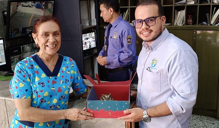 Es un ave silvestre por lo que de inmediato se llamó a Cortolima para que lo recogieran, se encargaran de su salud y devolverlo a la naturaleza. Efectivamente Cortolima envió a James Herrán, un Biólogo que se hizo cargo del Megascops Choliba