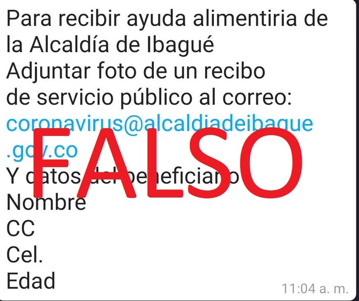 “La Alcaldía de Ibagué informa a la población, que se encuentran circulando mensajes y cadenas de WhatsApp FALSAS que indican el correo electrónico y los datos que deben enviar las personas que están interesadas en acceder a los Kits nutricionales anunciados por el Alcalde Andrés Hurtado".