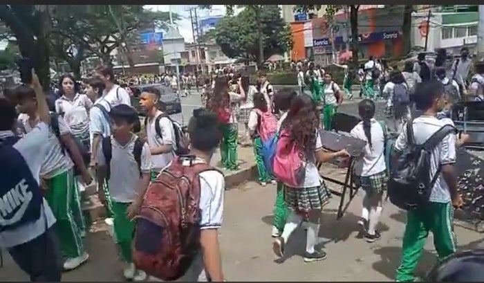 A esta hora y pese a la inclemencia del clima que se registra en diferentes puntos de la ciudad, estudiantes del colegio San Simón, tienen bloqueada la carrera Quinta con calle 37 en los dos carriles, y donde sacando los pupitres de las aulas donde hacen un llamado a las garantías educativas como es el caso del PAE y a la culminación de obras que según los jóvenes, están en “veremos”, pues llevan años esperando la respuesta por parte de la Secretaría de Educación y el Gobierno Local, razón por la que ahora se toman las calles buscando una reacción con respuesta puntual.