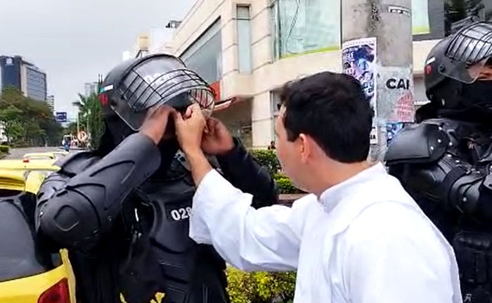 Un seminarista en este momento se encuentra imponiendo la ceniza a miembros del Esmad que están apostados en la Avenida 60 con carrera Quinta, llevándole a los católicos que hacen parte de dicha institución y se encuentran cumpliendo su deber, la posibilidad de recibir la ceniza en su lugar de ubicación.