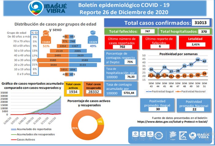 No para el incremento de las cifras del Covid-19 en Ibagué, de acuerdo con el último informe el Instituto Nacional de Salud reveló, que se llegó a 1.934 casos activos del virus y sumaron 702 nuevos contagios; la autoridad sanitaria también, reportó seis fallecimientos.