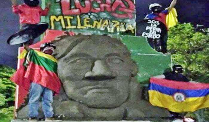 Ayer durante la jornada de manifestaciones en la capital tolimense, un grupo de jóvenes se tomaron las inmediaciones del viaducto del SENA para colocar un nuevo busto, después de pintar y adecuar el sitio para la nueva ubicación de un indígena, que según los participantes se hacía un homenaje a los antepasados pijaos.