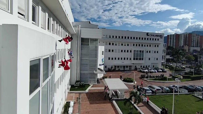 Representado por varios personajes del Grupo de Entrenamiento de Altura de Tolima, Papá Noel descendió por la fachada de la Clínica Keralty, los enviados del Polo Norte llegaron a las ventanas de las habitaciones de los pequeños hospitalizados con un cartel de Feliz Navidad, luego pasaron por la ventana de la Sala de Espera del Tercer Piso en donde saludaron al Grupo de Pequeños pacientes que se reunido allí.