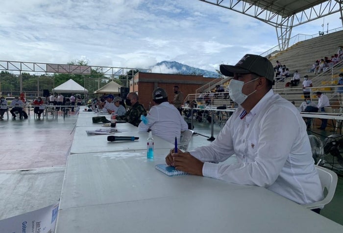 Después de instalar la sesión PDET en el estadio de Chaparral, el Consejero Archila cruzó la vía para ingresar al Club de Comfenalco donde se reunió presencialmente con víctimas del Sur de Tolima y se conectó a través de plataformas virtuales con mujeres de Catatumbo y de la Sierra Nevada y Perijá.