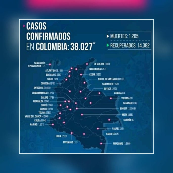 La distribución geográfica de los 38.027 casos que se han presentado en el país desde hace exactamente tres meses (6 de marzo), que se presentó el primero, es la siguiente: Bogotá 12.564, Meta 988, Guainía 6, Vaupés 11, Caquetá 25, Amazonas 1.980, Putumayo 11, Huila 253, Nariño 1.551, Cauca 144, Valle del Cauca 4.360, Tolima 280, Quindío 212, Chocó 396, Risaralda 274, Caldas 173, Cundinamarca 1.177, Antioquia 1.451, Córdoba 210, Sucre 97, Bolívar 3.969, Atlántico 6.141, San Andrés y Providencia 17, La Guajira 107, Magdalena 751, Cesar 425, Norte de Santander 133, Santander 150, Boyacá 223, Arauca 2, Vichada 1 y Casanare 36.
