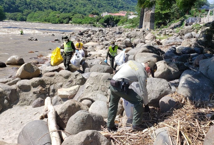 La cita con el medio ambiente y el equilibrio ecológico se dio en el sector conocido como ‘Pacho Mario’ de esa localidad, lugar en donde los uniformados de Policía con el apoyo de empresa, pescadores y comunidad, llevaron a cabo esta jornada de limpieza y embellecimiento, en donde se logró la extracción de cerca de una tonelada de residuos sólidos como llantas, botellas en plástico y vidrio, prendas de vestir desechables, piezas de aluminio, baldes plásticos, colchones, poltronas, entre otros, los cuales estaban contaminando uno de los ríos más importantes del país.