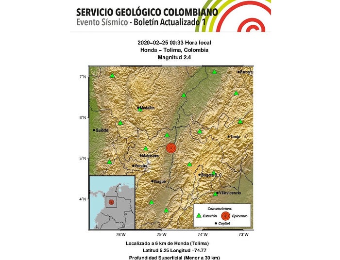 Según el boletín del Sistema Geológico Colombiano, la actividad sísmica se presentó sobre las 12:33 horas de hoy, martes 25 de febrero.
