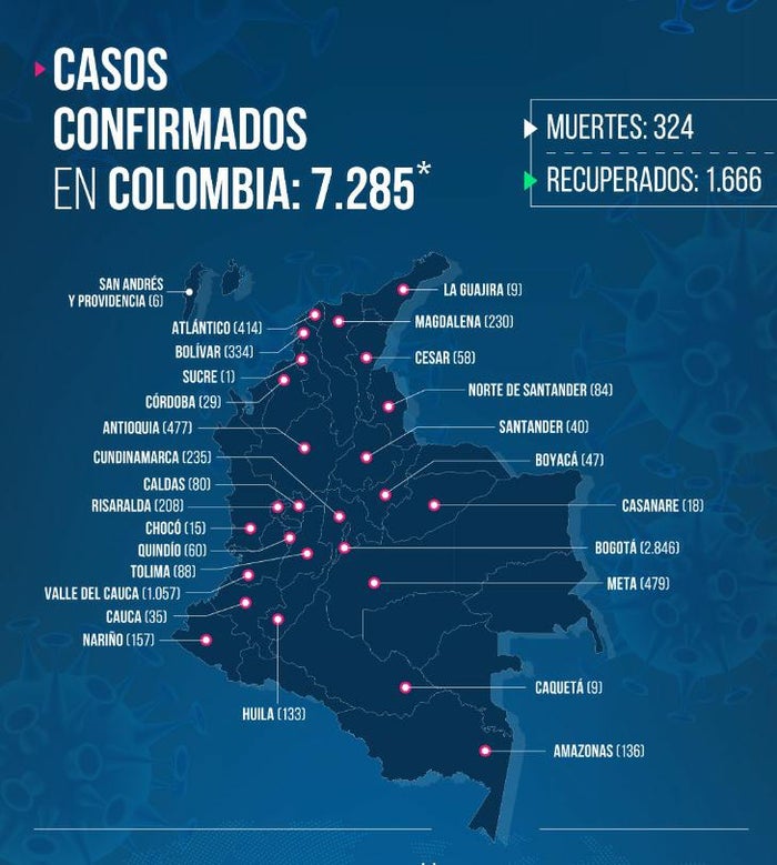 Hace unos minutos el Ministerio de Salud y Protección Social público el nuevo reporte del número de contagiados por COVID-19 en el país, el cual llega a los 7.285, 279 nuevos casos en menos de 24 horas.