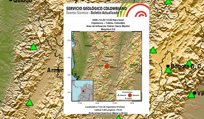 A las 12:36 de este viernes 2 de diciembre . Magnitud 4.5. Profundidad 12.36 Área de Influencia Volcán Cerro Machín, localizado a 7 km de la cabecera municipal de Cajamarca Tolima.