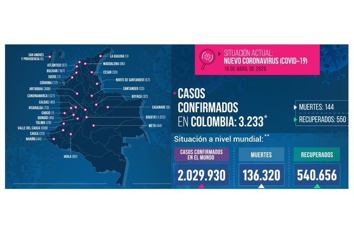 A nivel mundial hay un total de 2’029.930 casos confirmados en el mundo, de los cuales 136.320 han perdido la batalla contra el coronavirus.