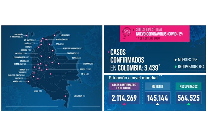 A nivel Nacional, Minsalud indicó que de ayer a hoy hubo un incremento en el número total de afectados por el COVID-19 de 206 nuevos contagios, llegando así la cifra a 3.439 infectados.