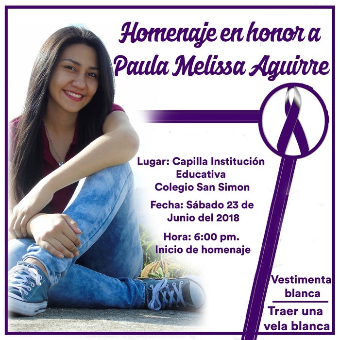 Así mismo, para el próximo sábado 23 de junio a las 6:00 pm en las instalaciones de la capilla del colegio San Simón, se le rendirá un homenaje a la joven, quien lamentablemente recibió más de 50 agresiones con arma blanca a manos de su novio de 20 años, quien a ésta hora permanece recluido en la cárcel Nacional de Picaleña.