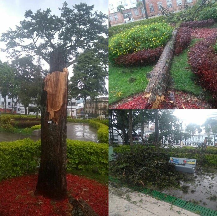 Es así que producto del aguacero de que se precipitó en la ciudad de Ibagué, uno de los árboles de la Plaza de Bolívar se partió y terminó cayendo sobre unas bancas ubicadas frente a las instalaciones de la Alcaldía.