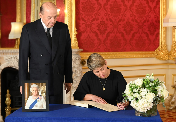 Cortesía Cancillería de Colombia Primera dama Verónica Alcocer y canciller Álvaro Leyva firmando el libro de condolencias en Lancaster House, Londres, por la muerte de la reina Isabel II, antes de participar en el funeral de Estado.