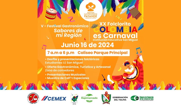 Payandé se prepara para disfrutar de la XX versión del Folclorito “Colombia es carnaval de la IE San Miguel y V versión del Festival Gastronómico “Sabores de nuestra Región”. El cual tendrá lugar el próximo domingo 16 de junio de 7:00 a.m. a 6:00 p.m. en el parque principal del corregimiento de Payandé.