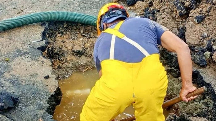 El personal operativo trabaja en el destaponamiento, producto de material de arrastre que se presentó en la línea de conducción de agua hacia la planta Chembe.