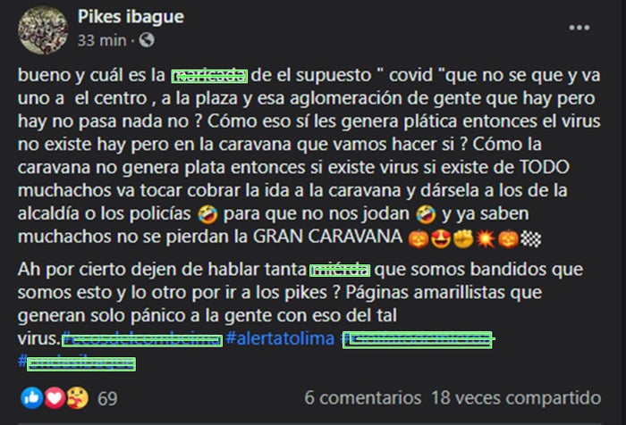 Aseguró, que desconoce de dónde es el grupo de Facebook ´Pikes Ibagué´, pero al mismo tiempo indicó, que ya están averiguando con la Policía Metropolitana de Ibagué, quiénes son los promotores de esta irresponsabilidad que podría aumentar los casos de covid-19 en la ciudad de Ibagué.