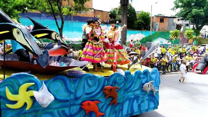 Una florida carroza pentagramada. Entre tamboras, bailarinas, y el típico rajaleñero con su guitarra, representa la festividad Musical de la tierras Tolimenses.